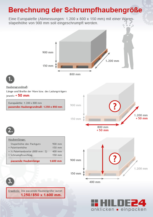Schrumpfhauben zählen zu den wirksamsten Methoden der Palettensicherung. Sie eignen sich ideal zur Stabilisierung und Sicherung schwerer Transportgüter wie z. B. Lebensmittel, Baustoffe oder Maschinen. Die robusten Folienhauben (reißfest, durchstoßsicher etc.) werden einfach über das fertige Palettengebinde gestülpt und anschließend mit Hilfe einer Schrumpfpistole (z. B. Ripack® 3000) in Minutenschnelle erhitzt und eingeschrumpft. Die Folie zieht sich hierbei derart zusammen, dass sie stramm am Packgut anliegt und dieses wirksam vor Transportschäden durch Verrutschen, aber auch Feuchtigkeit, Verschmutzung oder Diebstahl schützt. Um ein optimales Ergebnis zu erzielen und unnötige Kosten zu vermeiden, sollten Sie stets die richtige Haubengröße verwenden. Wie Sie diese berechnen, zeigen wir Ihnen hier.